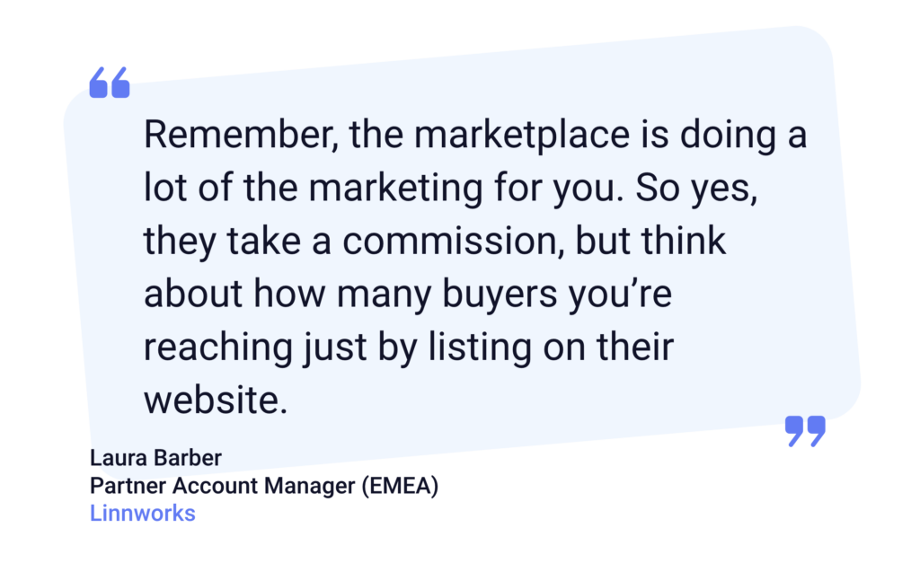 “Many of our sellers will have their own Shopify, WooCommerce, or Magento store, as well as selling across the various marketplaces,” says Barber. “It’s about finding the right balance for your business. You can have a website and spend an awful lot of money trying to get your website up there on Google, or you can pay a marketplace commission. Remember, the marketplace is doing a lot of the marketing for you. So yes, they take a commission, but think about how many buyers you’re reaching just by listing on their website.”