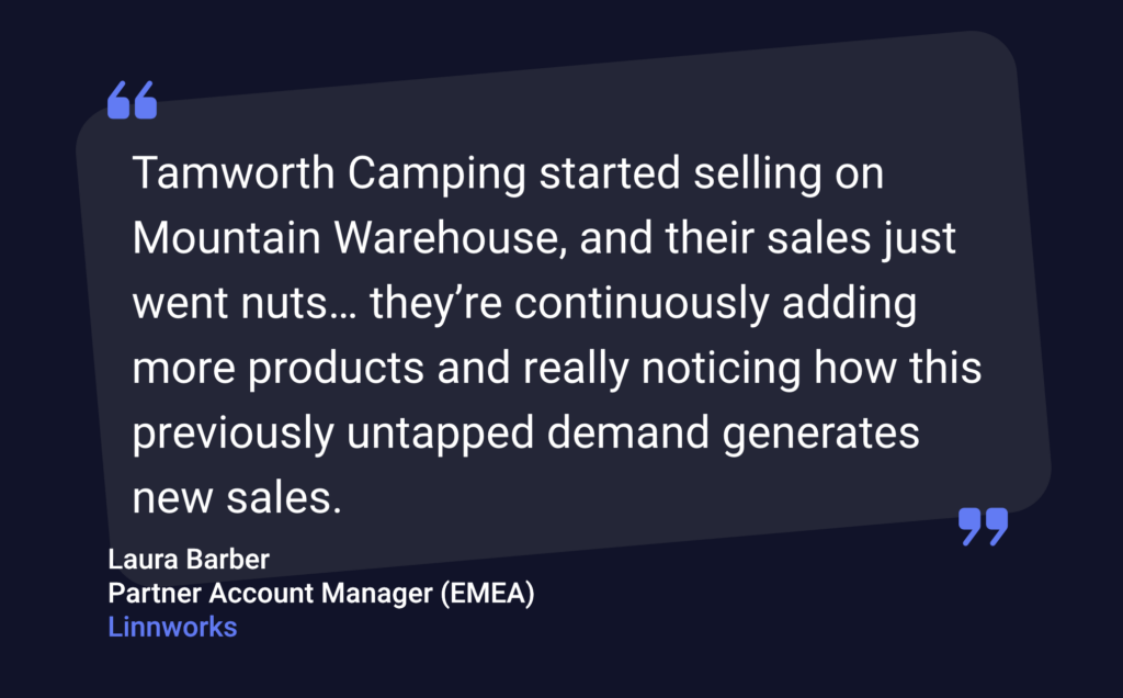 Tamworth Camping started selling on Mountain Warehouse, and their sales just went nuts,” says Barber. “Tamworth Camping is continuously adding more products to the Mountain Warehouse marketplace and really noticing how this previously untapped demand generates new sales.”.