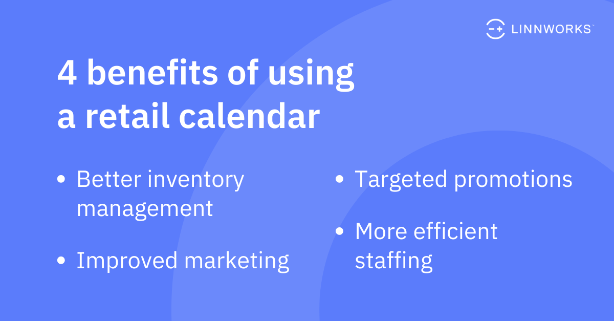 Retail calendars inform your staffing needs, especially for seasonal businesses. Optimizing staffing levels helps improve the customer experience, reduce wait times and improve order processing and fulfillment.