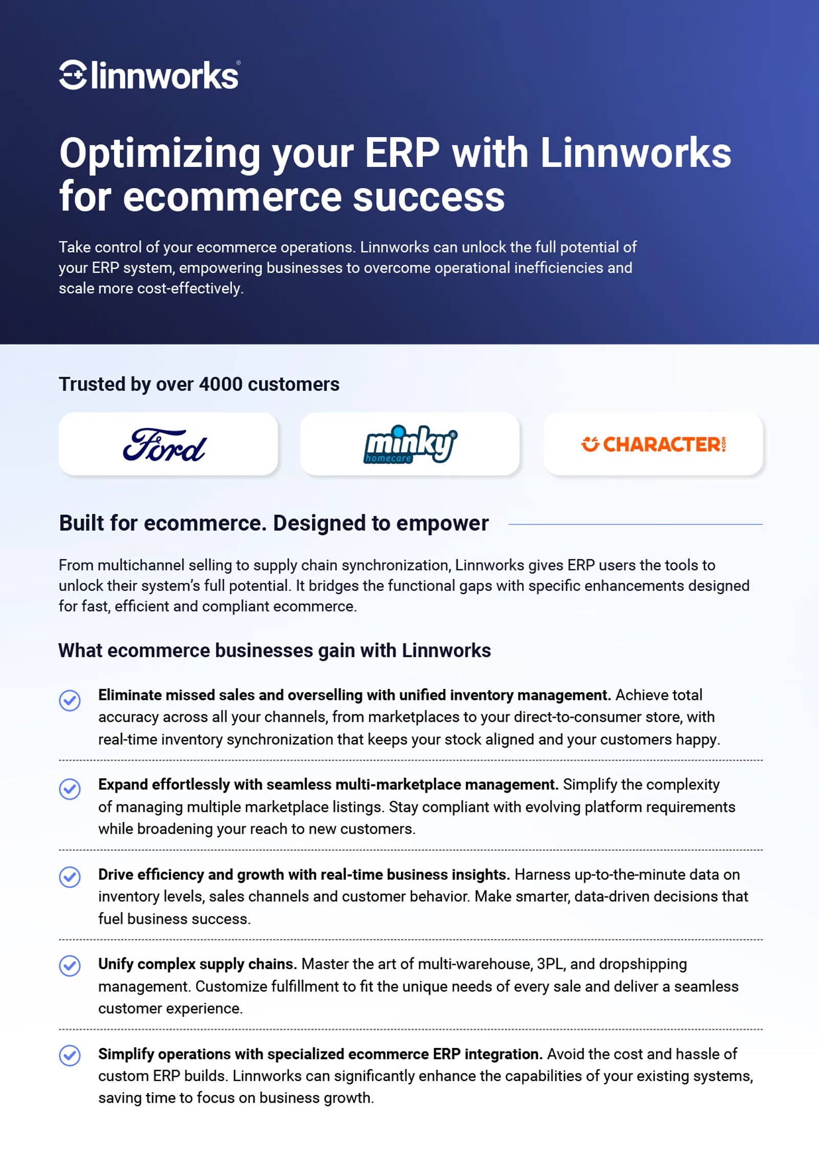 Enhance your ERP with Linnworks to streamline inventory, automate fulfillment, and simplify multichannel ecommerce.