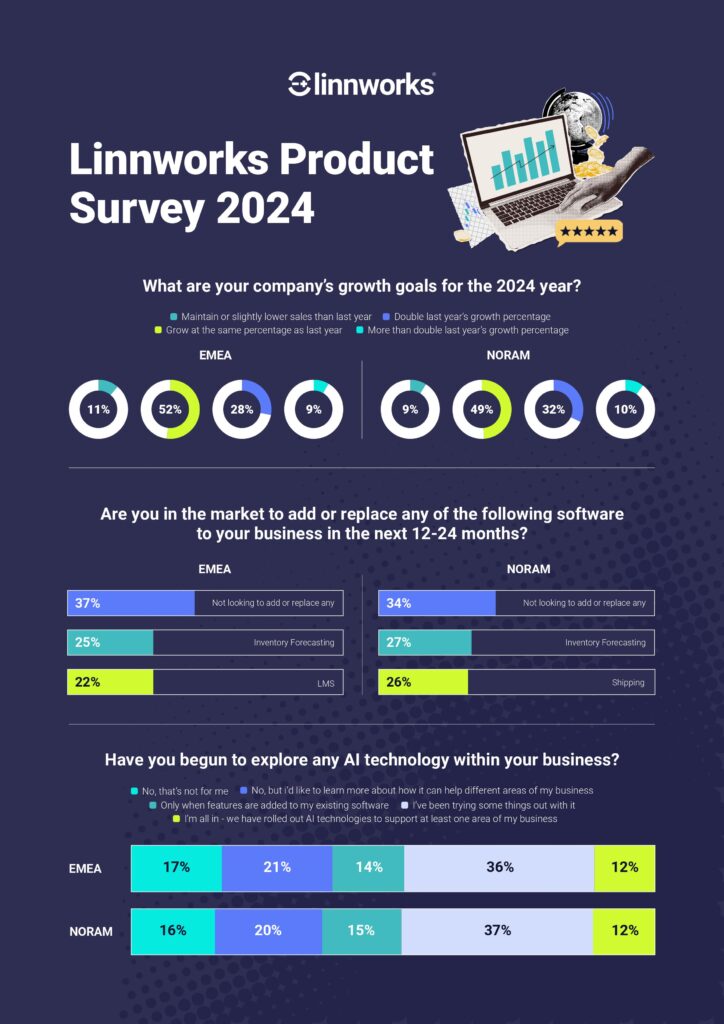 What are global companies’ growth goals for the year ahead? Which geographies are they expanding into? And what software is supporting them along the way? The Linnworks Product Survey 2024 presents findings from our global customer base, and this infographic highlights some of the most interesting trends and findings from the report.